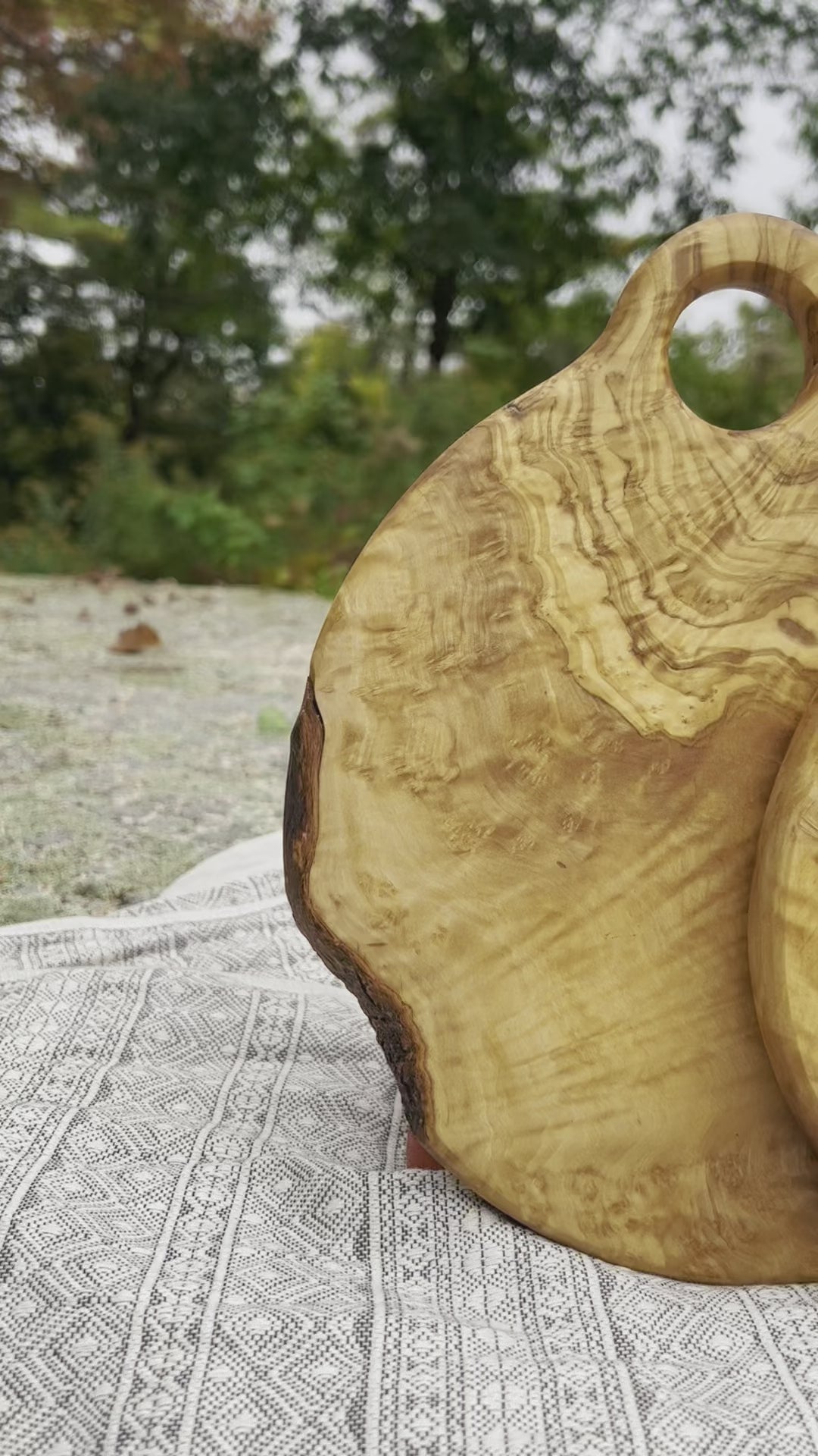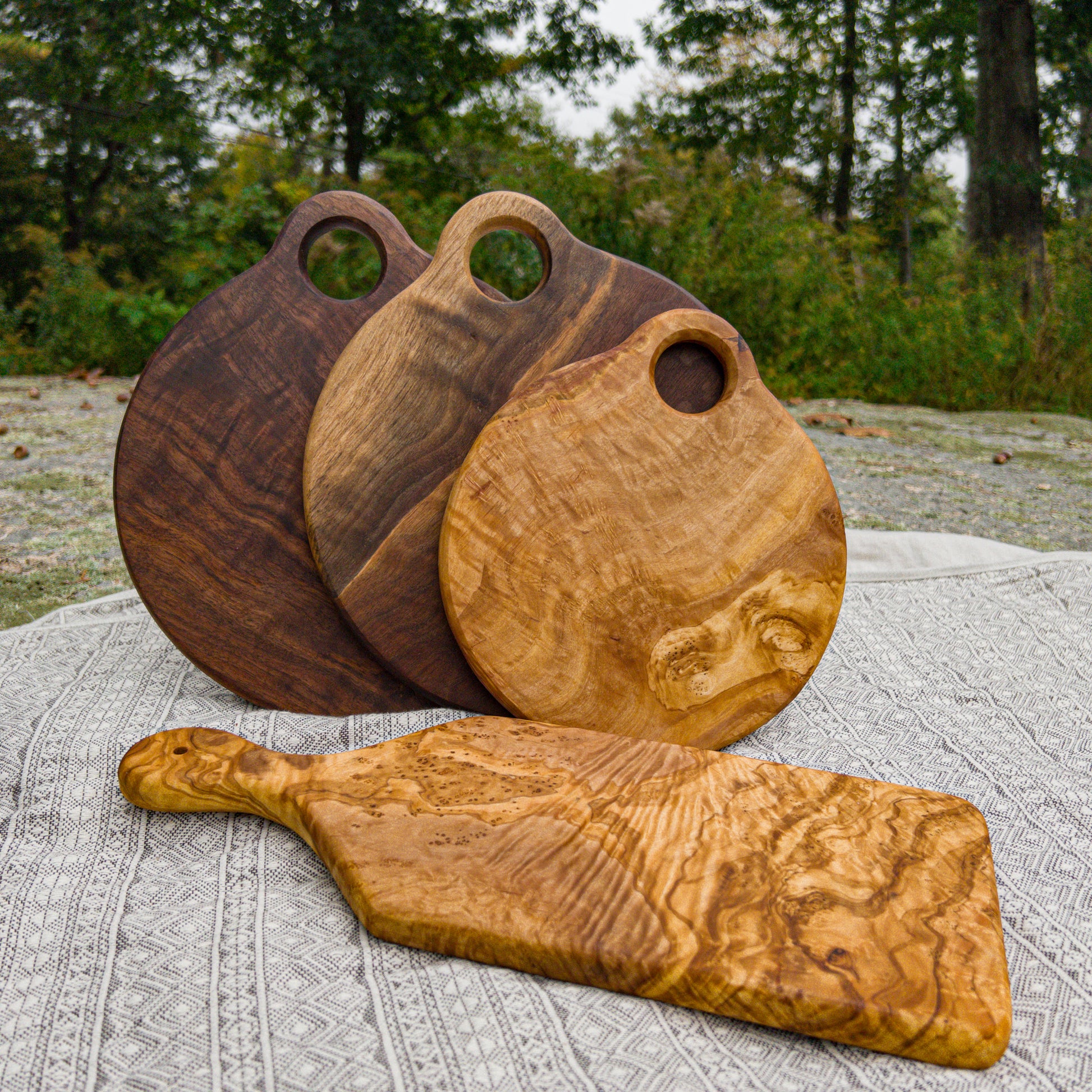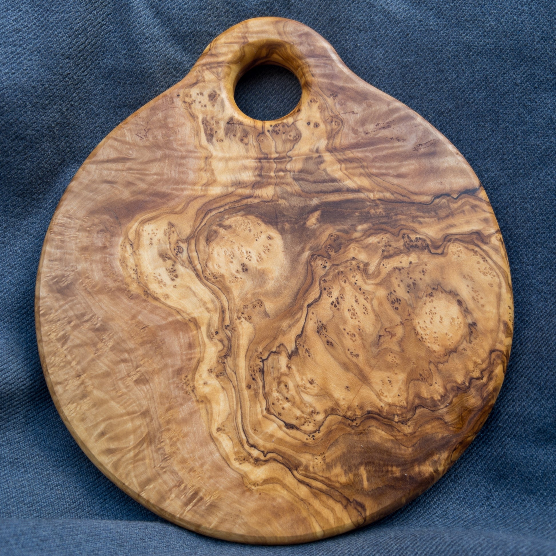 We present to you Little Ledge Woodwork's Olive Wood Round "Cue Ball" Cutting Boards. This proprietary design from Little Ledge Woodworks is equally at home on your countertop, showcasing the art of slicing and dicing, adorning your table with a tantalizing charcuterie spread, or resting elegantly on your wall, ready to embrace its next culinary adventure.